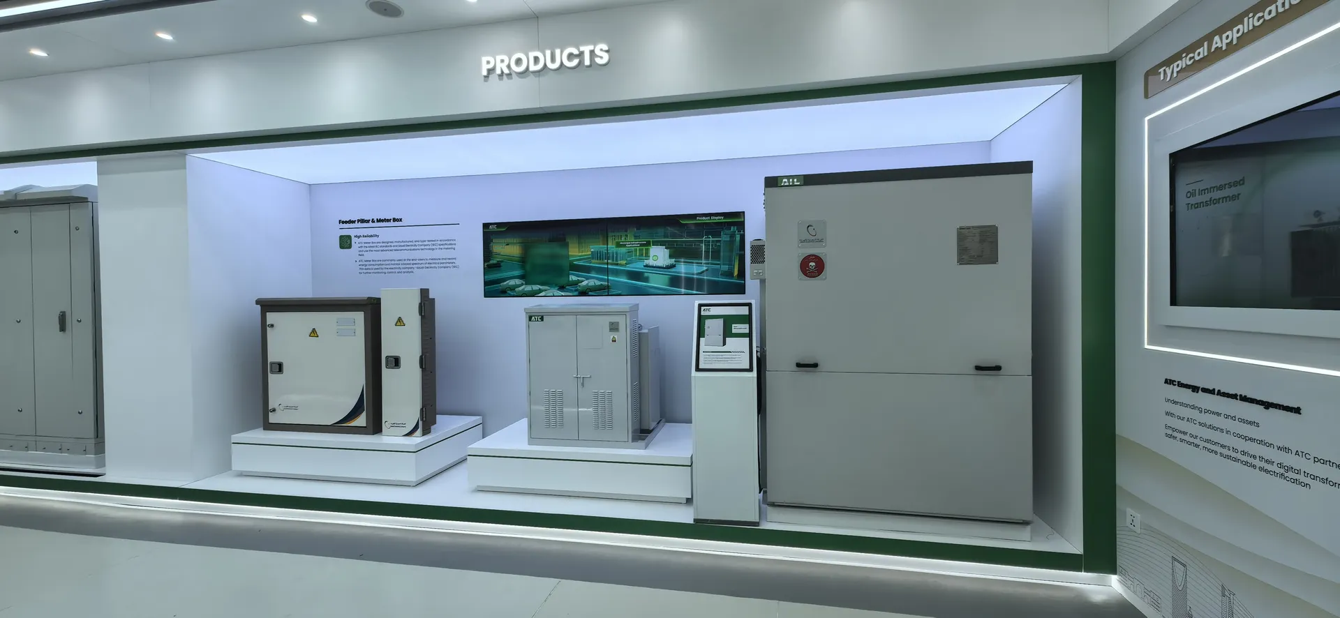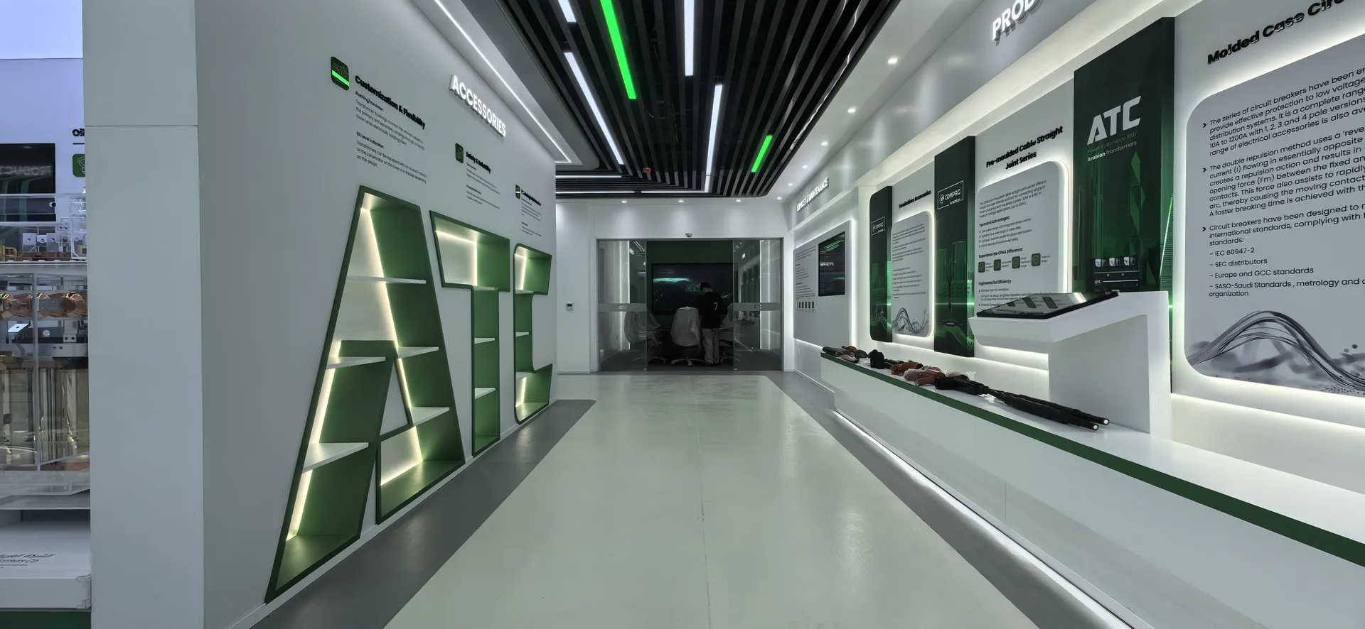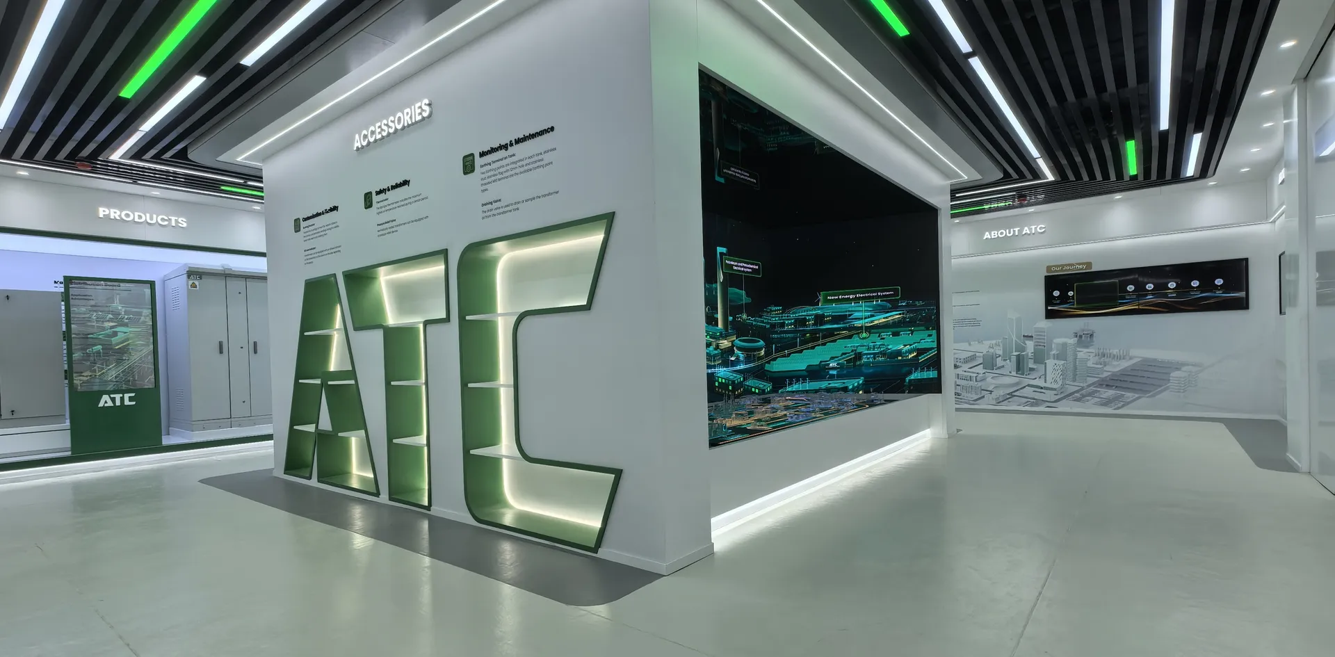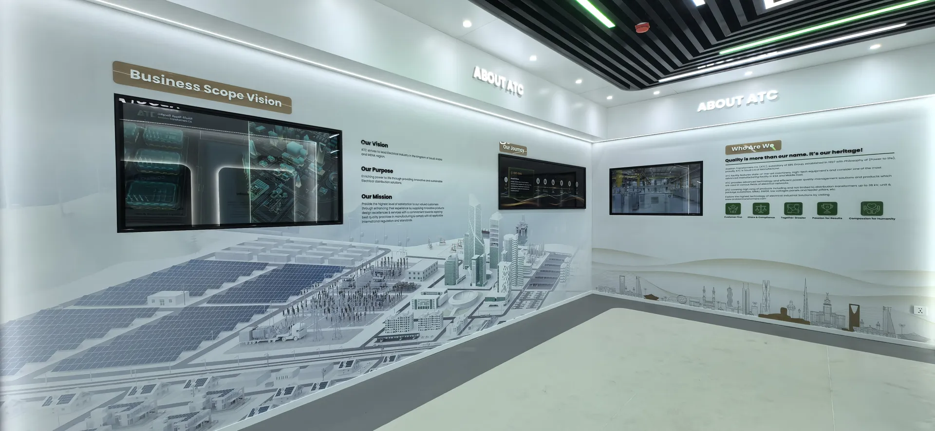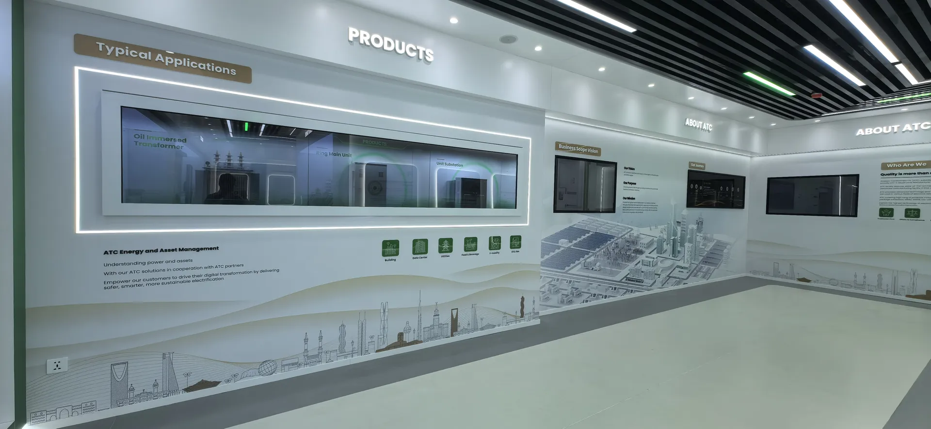 We primarily utilized the brand colors of energy green and sand gold and Saudi buildings’ silhouettes, aiming to create a display environment that not only featured ATC brand identity but also integrated regional cultural elements.