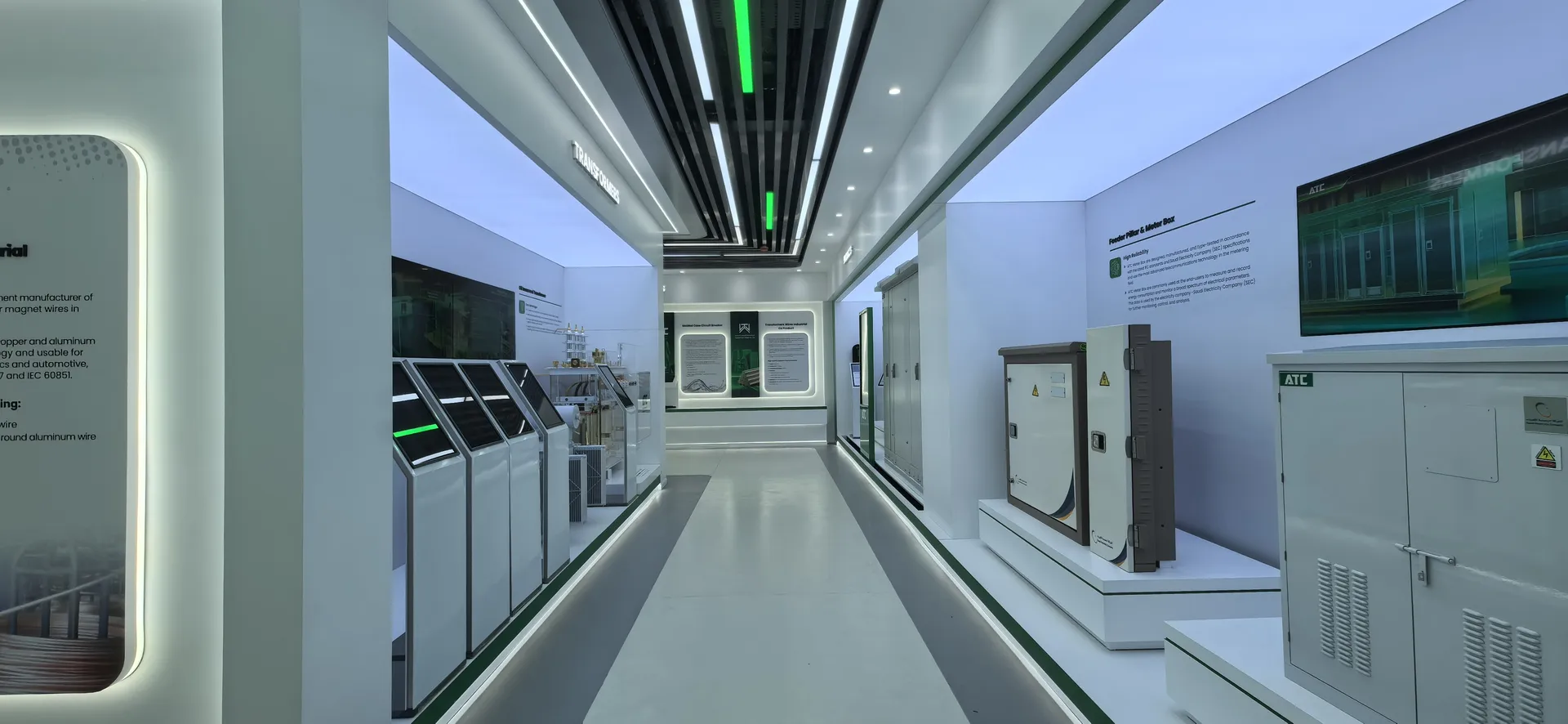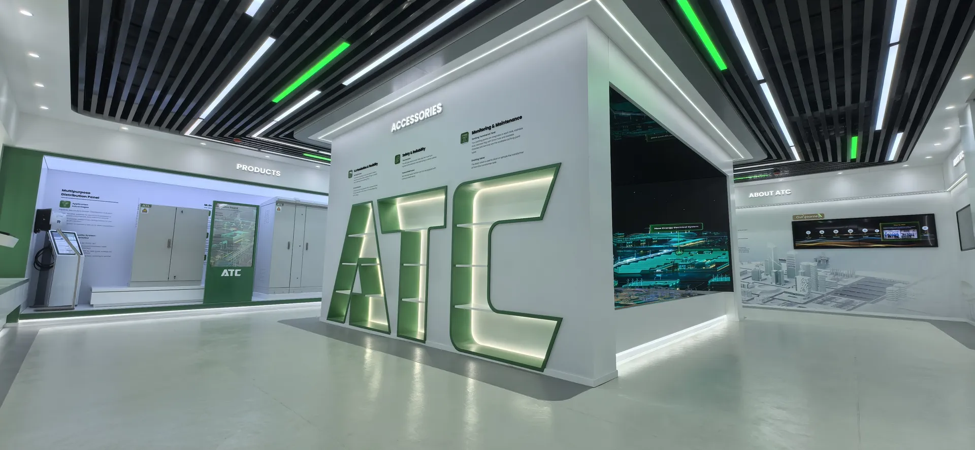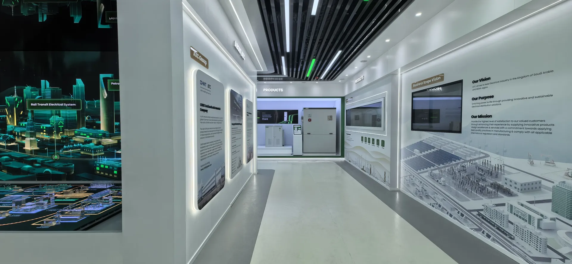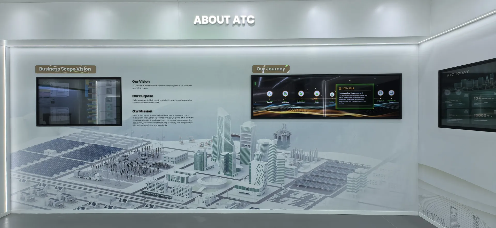 We primarily utilized the brand colors of energy green and sand gold and Saudi buildings’ silhouettes, aiming to create a display environment that not only featured ATC brand identity but also integrated regional cultural elements.