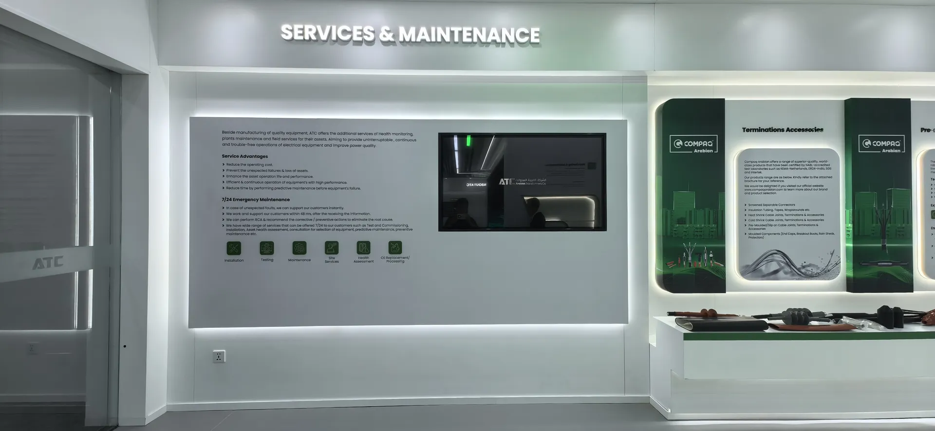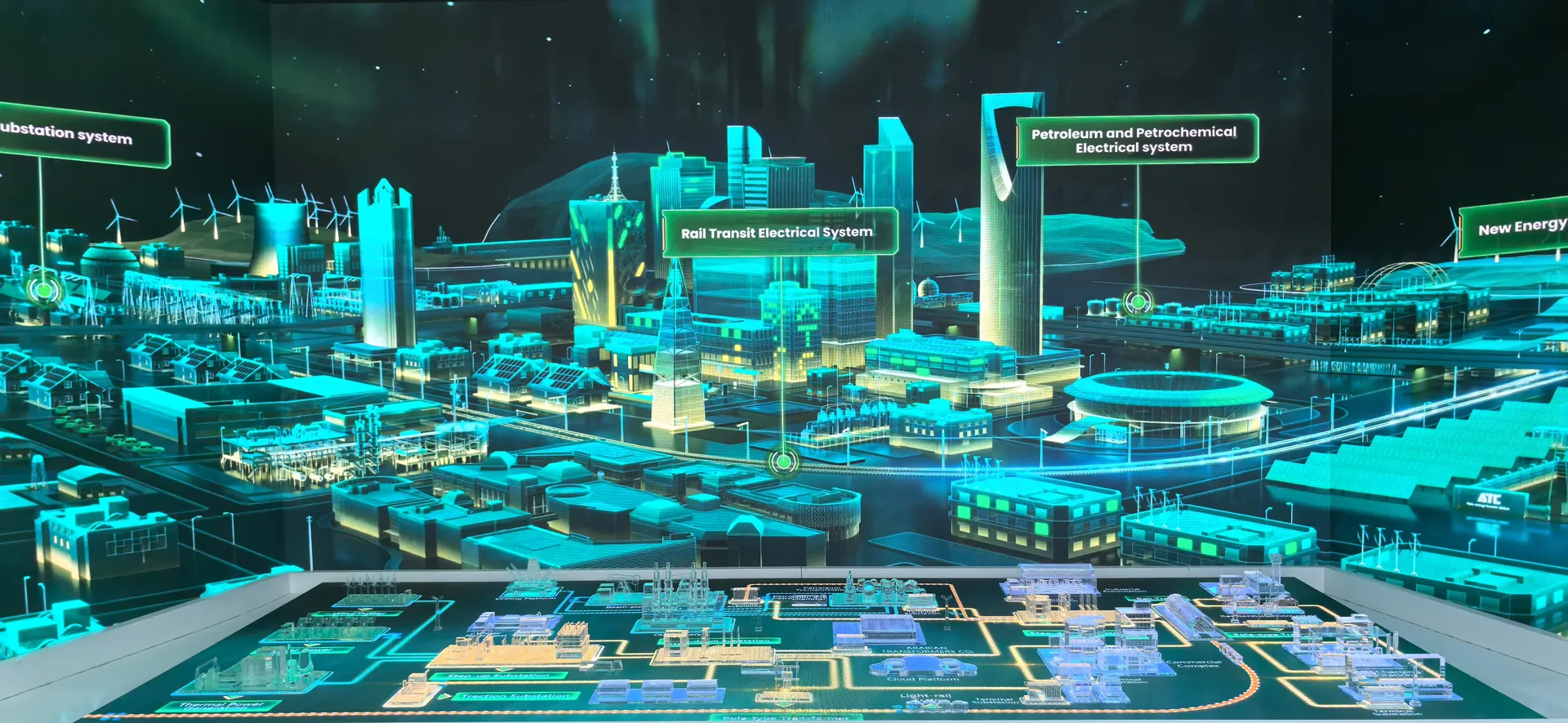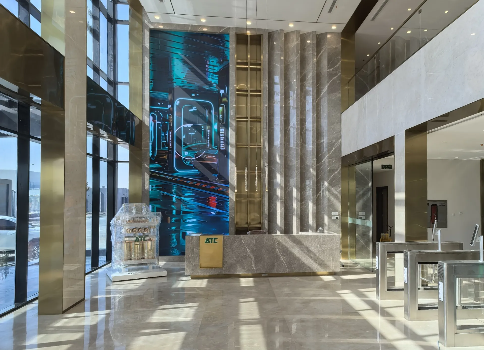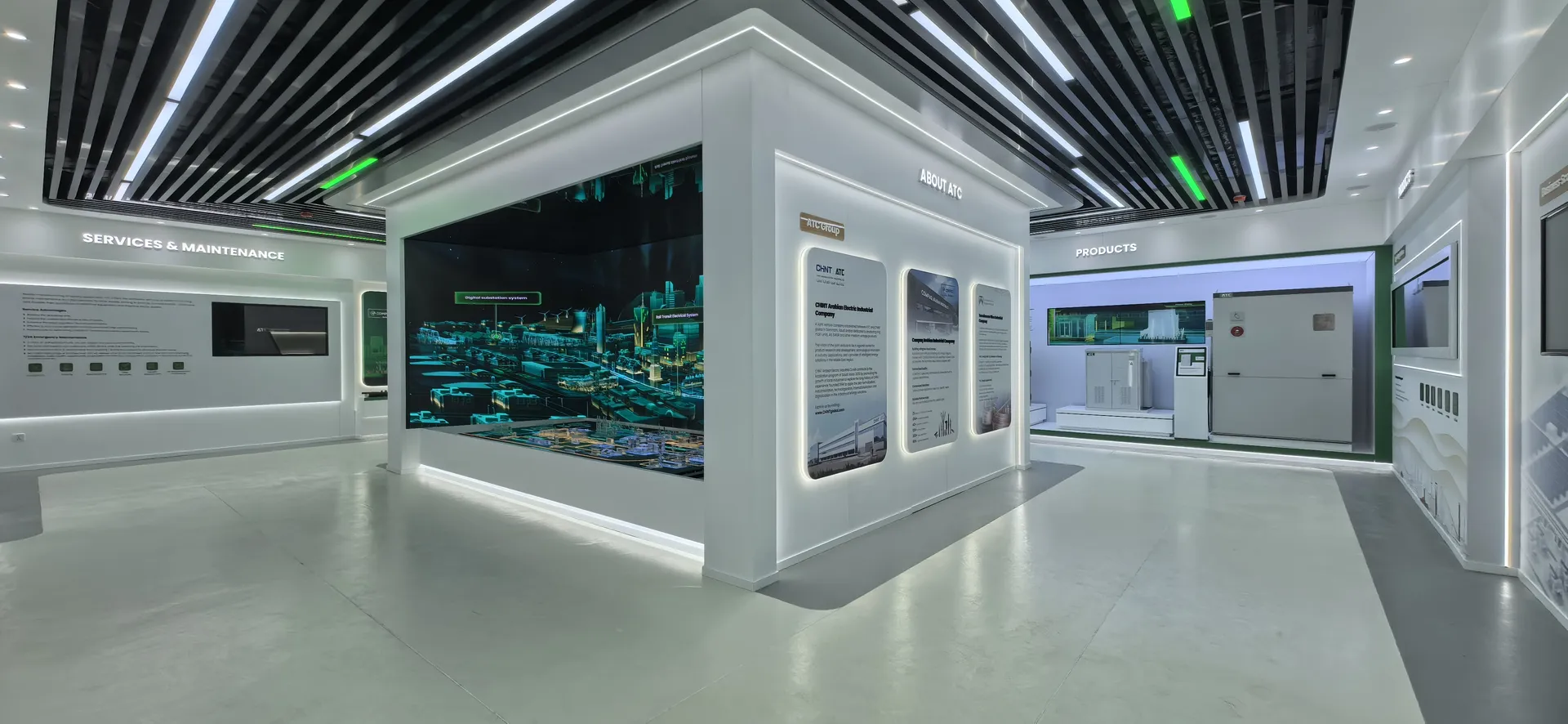 We primarily utilized the brand colors of energy green and sand gold and Saudi buildings’ silhouettes, aiming to create a display environment that not only featured ATC brand identity but also integrated regional cultural elements.